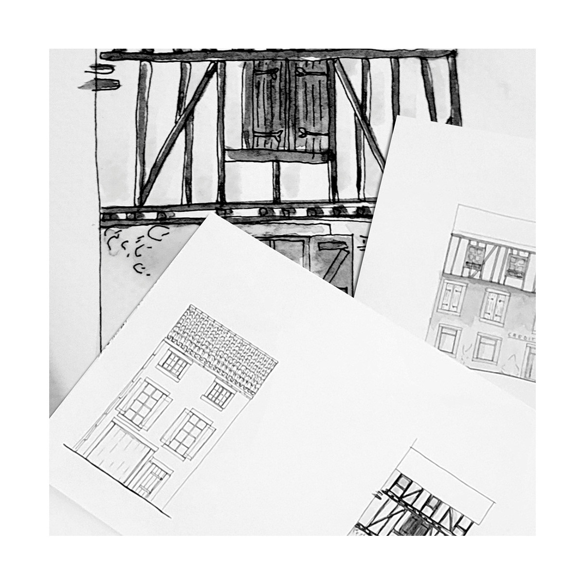 Dessins d'études en cours pour les typologies d'habitats de la bastide de Chalabre (Aude)